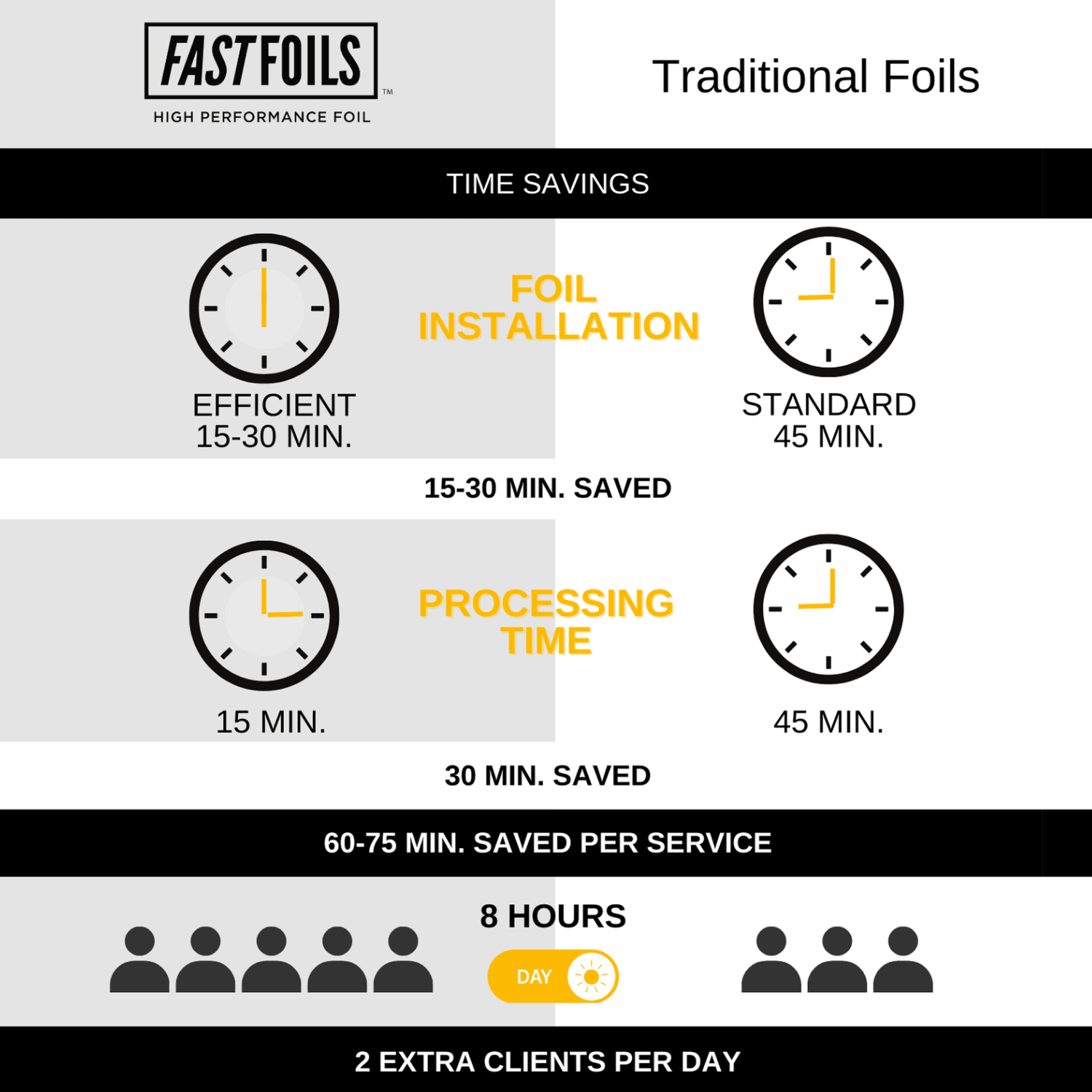 Den jämna temperaturen påskyndar den kemiska processen. Under den så kallade ”lyftningsinkubationen” skapar vår teknologi den perfekta balansen med rätt temperatur för att hårstråets fjällskikt ska kunna öppnas mjukt och jämnt. Folien kontrollerar miljön inuti genom att fördela värmen jämnt och behålla den längre. Det gör att behandlingstiden kan kortas med 25 %  – samtidigt som färgupptaget fördjupas.